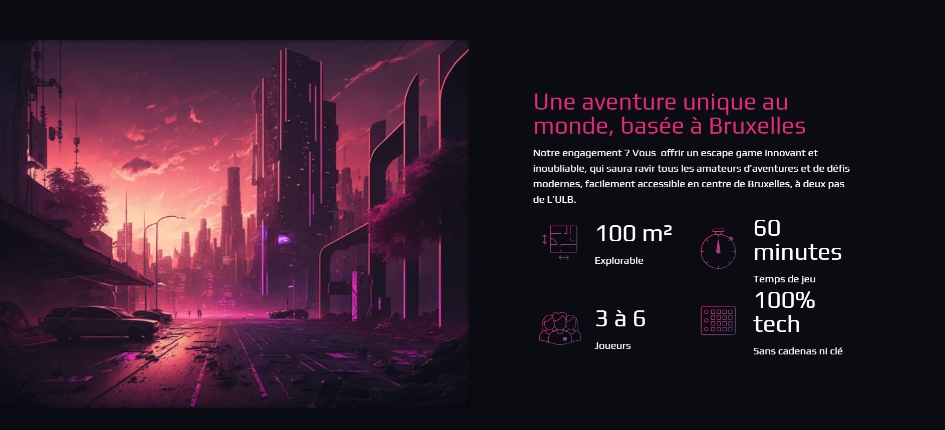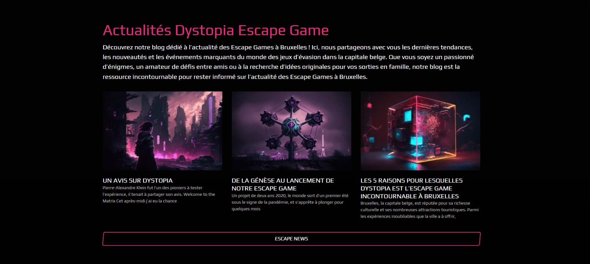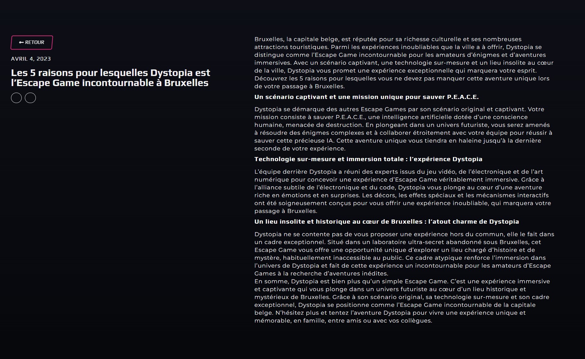 Pour enrichir l’expérience utilisateur et attirer l’intérêt des visiteurs, nous avons développé du contenu captivant et informatif. Cela inclut des descriptions détaillées des différents scénarios de jeu, des histoires immersives, et des témoignages de joueurs. Des photos professionnelles et des vidéos promotionnelles ont été intégrées pour donner un aperçu intrigant des défis proposés par Dystopia.